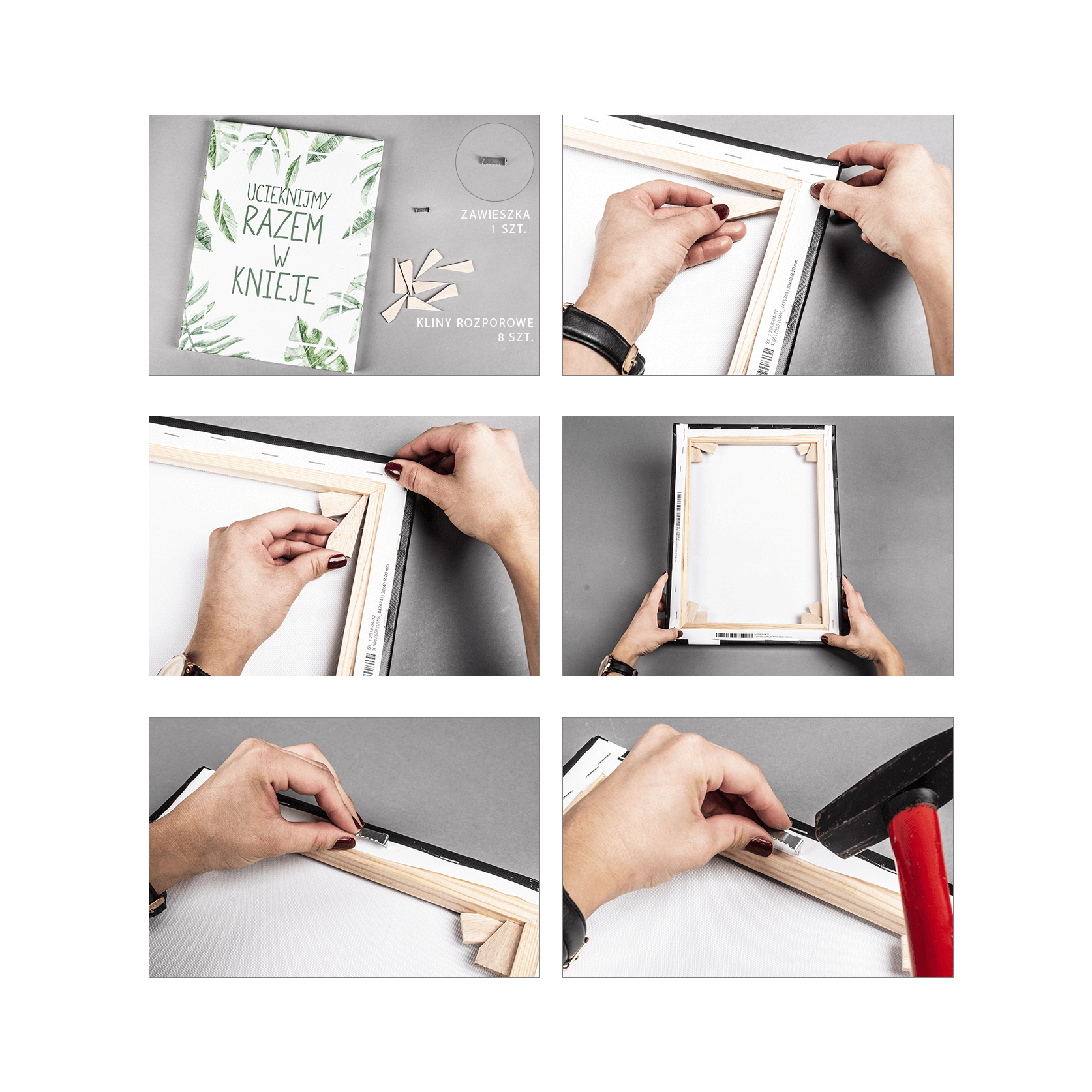 Jak już wiecie, w zestawie z fotoobrazem umieszczamy w przesyłce metalową zawieszkę i zagadkowe drewniane kliny... Jeśli nie wiecie, z czym to się je, to spieszymy z wyjaśnieniem. Metalową zawieszkę przybij delikatnie młotkiem do górnej drewnianej ramki. Będzie służyć do zawieszenia obrazu na ścianie.