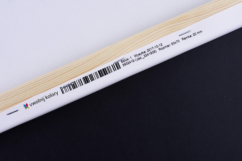 Na zawijce, czyli płótnie zawiniętym na ramie z tyłu nadrukowujemy kod kreskowy wraz z naszym logo.Kod kreskowy wraz numerami jest nam niezbędny do weryfikacji zamówień w procesie produkcji. Jeżeli chciałbyś usunąć nasze logo jest to możliwe za dodatkową opłatą. Dodatek należy wybrać w koszyku. Pamiętaj jednak, że usunięciu nie ulegnie wcześniej wspomniany kod kreskowy z numeracją.