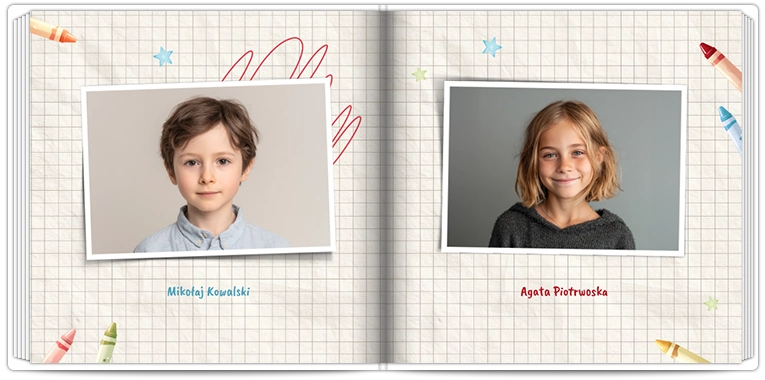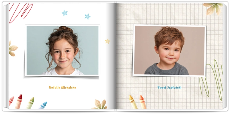 Pierwsza strona to wizytówka – w fotoksiążce szkolnej warto umieścić nazwę klasy, rok i wspólne zdjęcie. Taka kronika szkolna od razu wprowadza w klimat wspomnień.